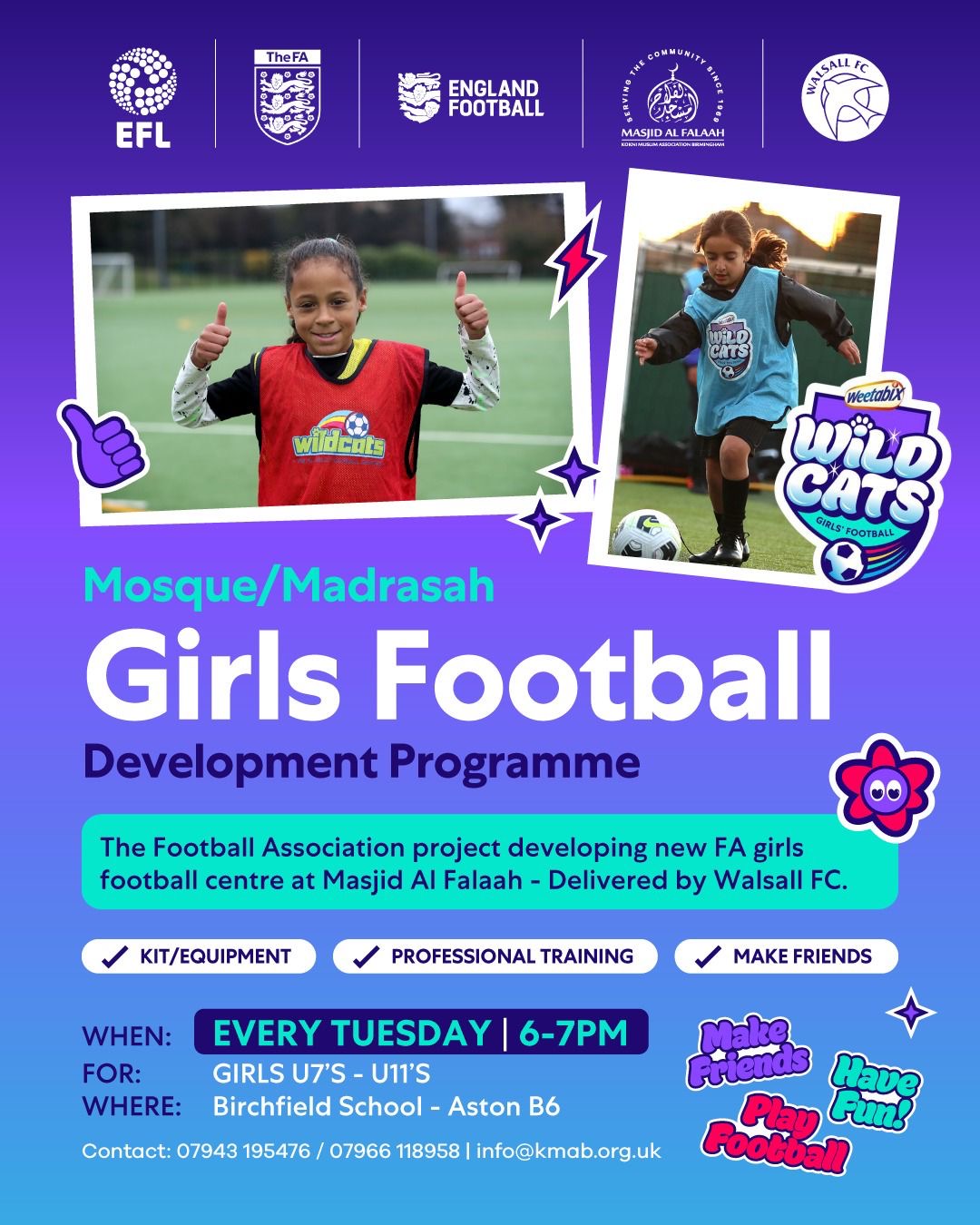 Masjid Al Falah in partnership with Walsall FC, Weetabix Wildcats and PACT have been able to offer this amazing opportunity for free girls football.